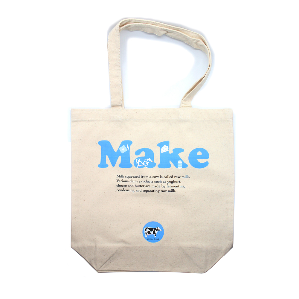 牛とミルク、そしてミルクからできるバター、チーズのイラストを描いたトートバックです。