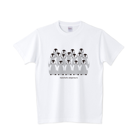 コウテイペンギンのひなたちがじぃ〜とこちらをみているイラストのTシャツです。